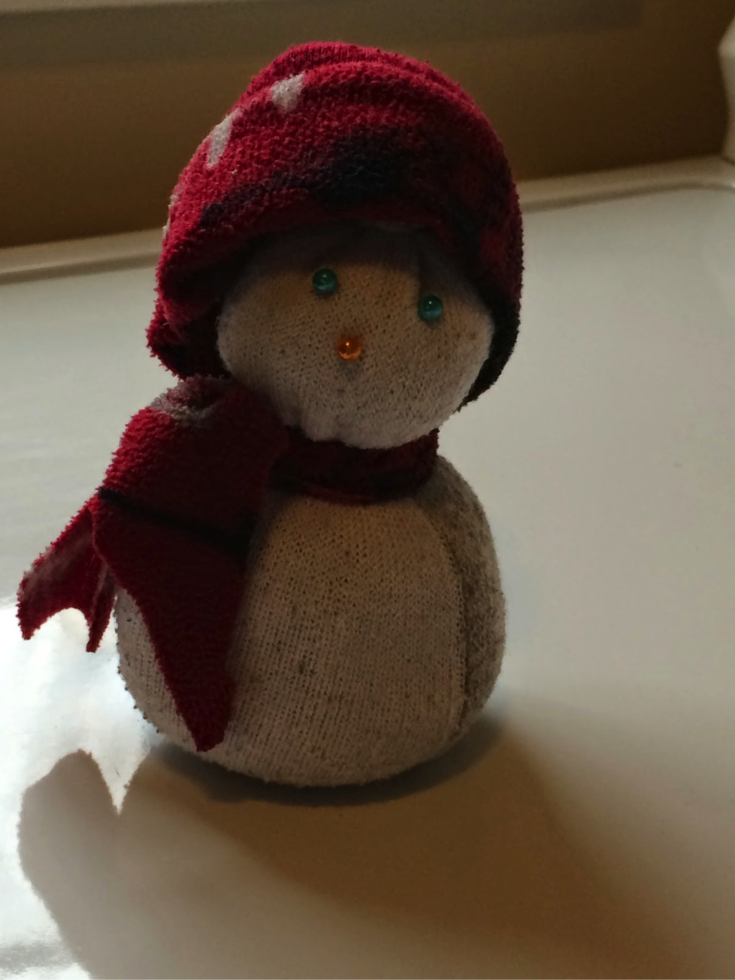 In December, it was time to start creating holiday crafts with the kids. I couldn’t wait! We have a holiday open house each year and we always give something to our guests as a small gift for the holidays. This year I came across Sock Snowmen on Pinterest. It looked easy enough and was using materials we had at home so we decided to try it. I had just cleaned through my son’s sock drawer and he had sixteen socks all with a hole in the same spot on the bottom of the foot. I decided to use these, but although they were clean, I had to try to get them whiter. I soaked them in warm water with a mix of three tablespoons hydrogen peroxide, two small squirts of dawn dish detergent and a tablespoon of baking soda. They soaked for well over an hour and the water was brown! Success…well almost. After stuffing the socks with rice and creating the snowmen, they still looked like, well, used socks.