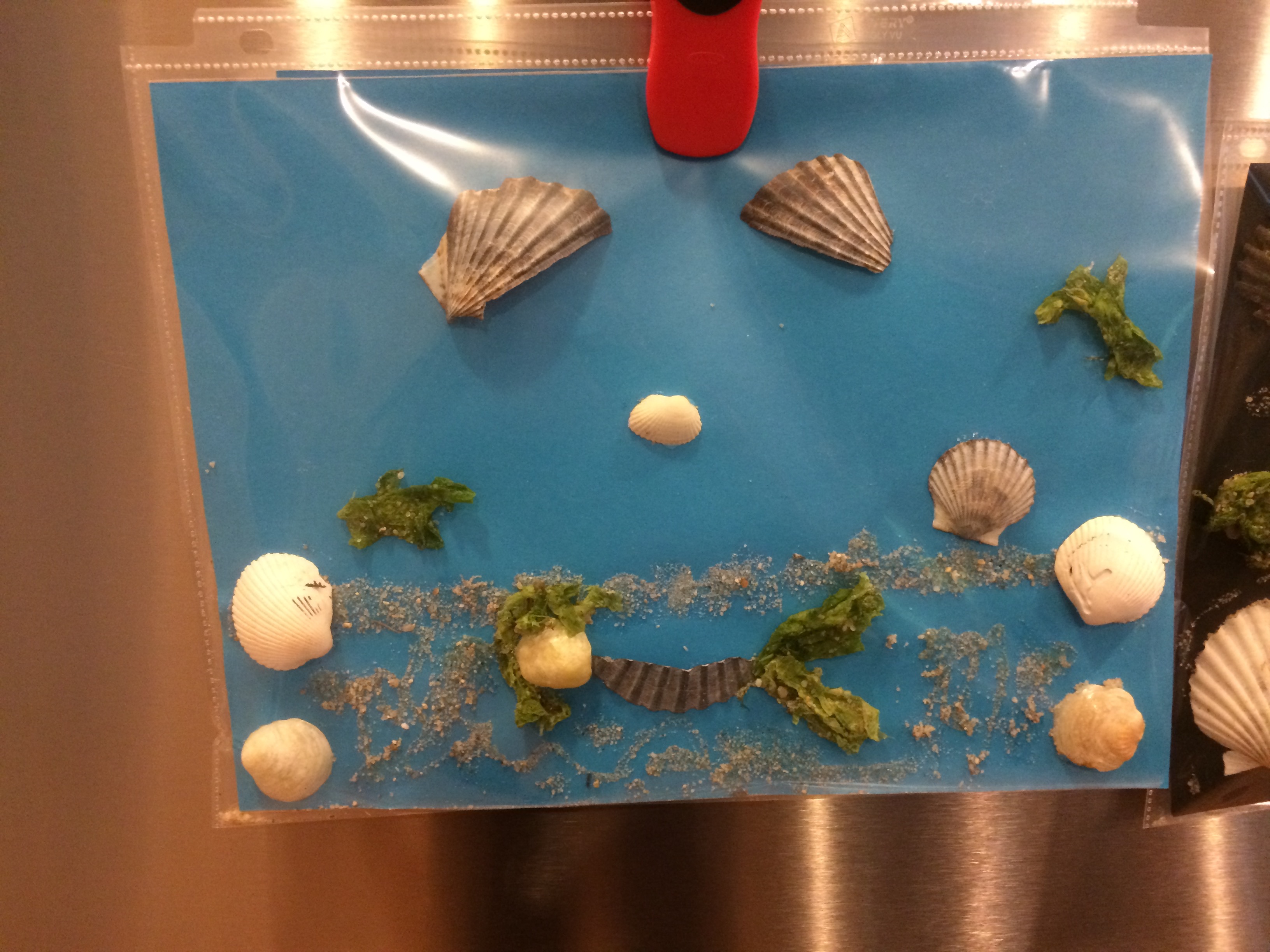 My daughter made an underwater 2-in-1 scene with a mermaid, but it is also a smily face. On the back she wrote a story.