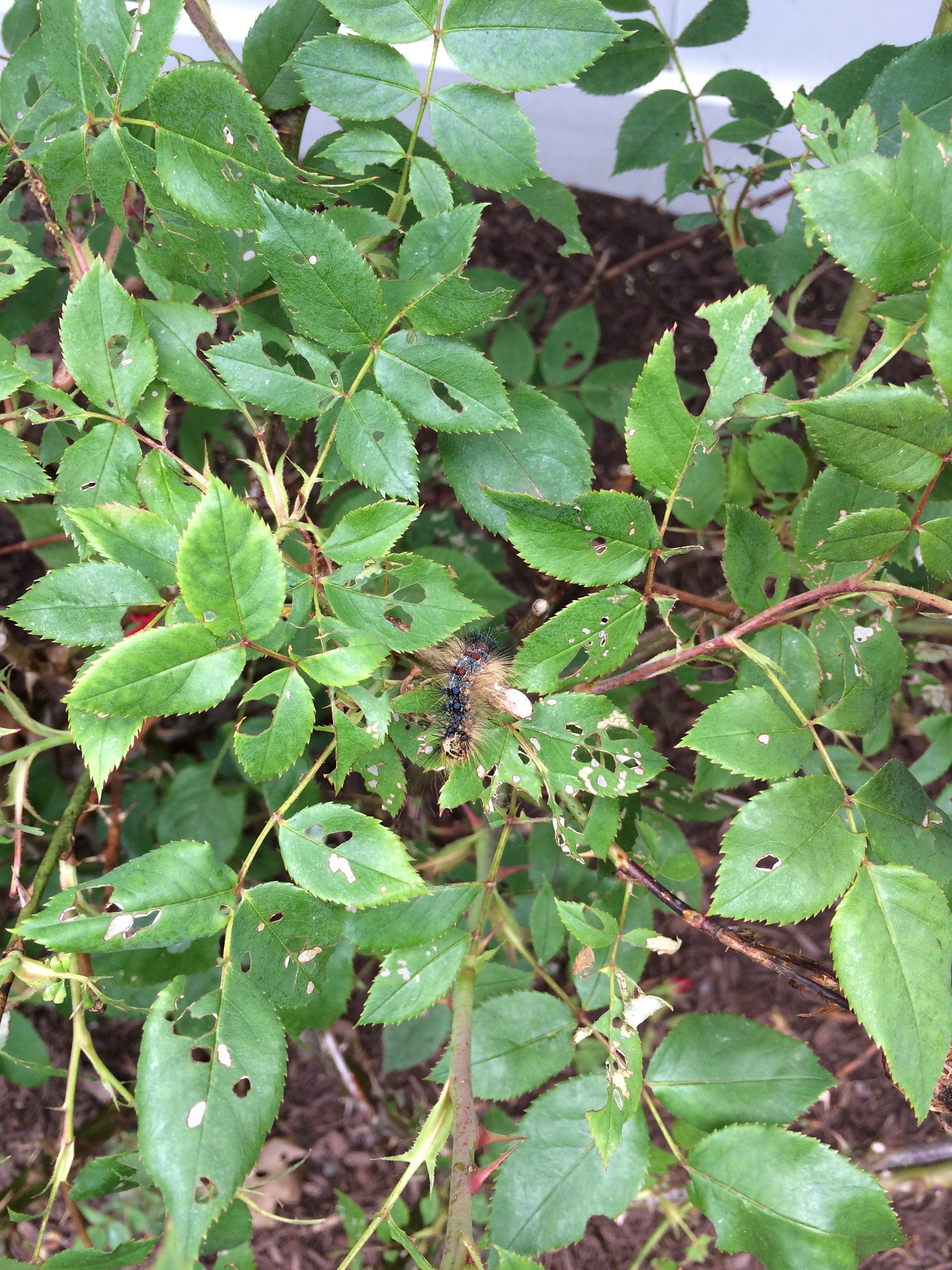 I went out to the roses to start spraying and I found the culprit. Three different kinds of caterpillars! It was like I was living inside Eric Carle’s The Very Hungry Caterpillar book. The kids got a bucket and as we started collecting the caterpillars, the bucket quickly filled up. We must have collected at least 50 caterpillars off of 4 bushes.