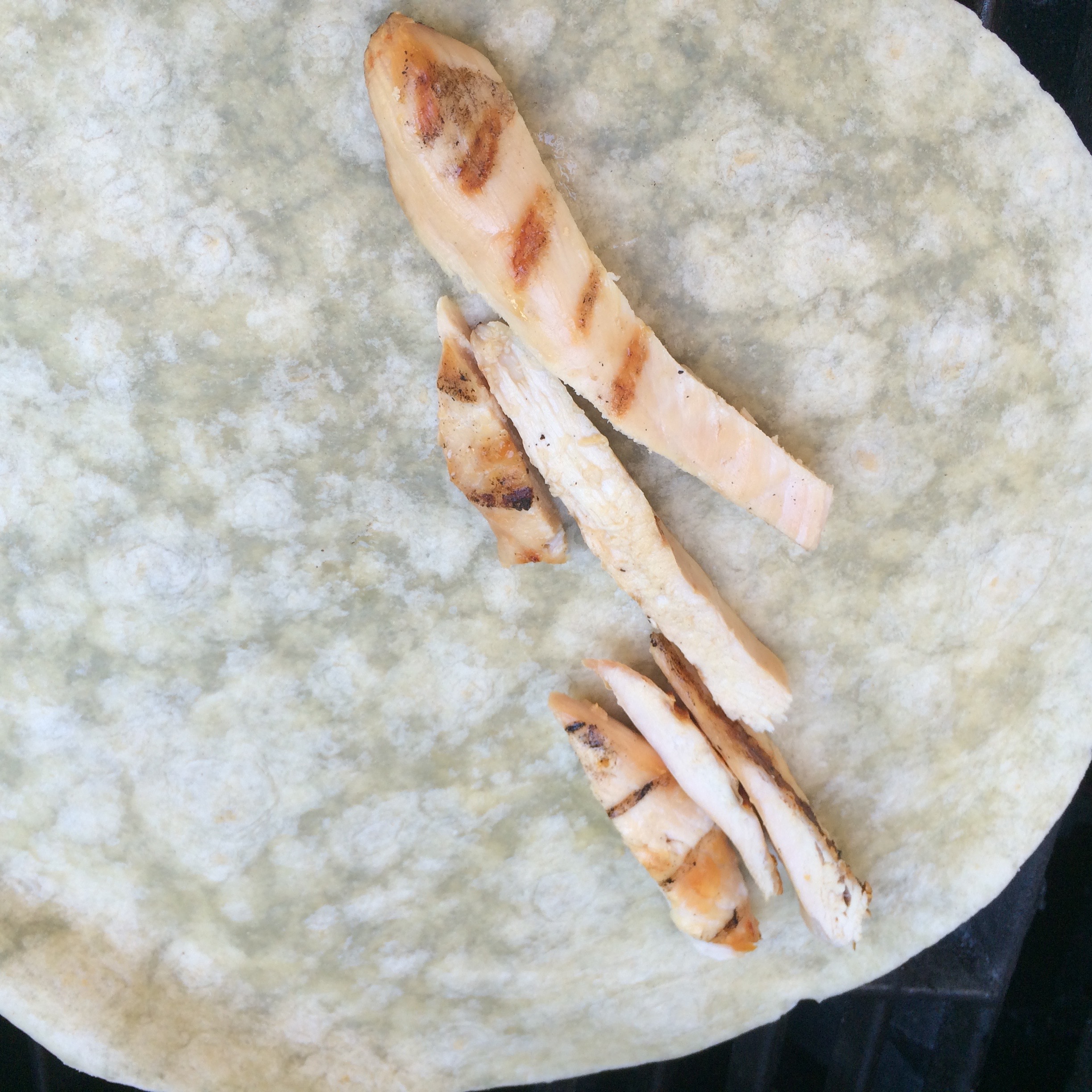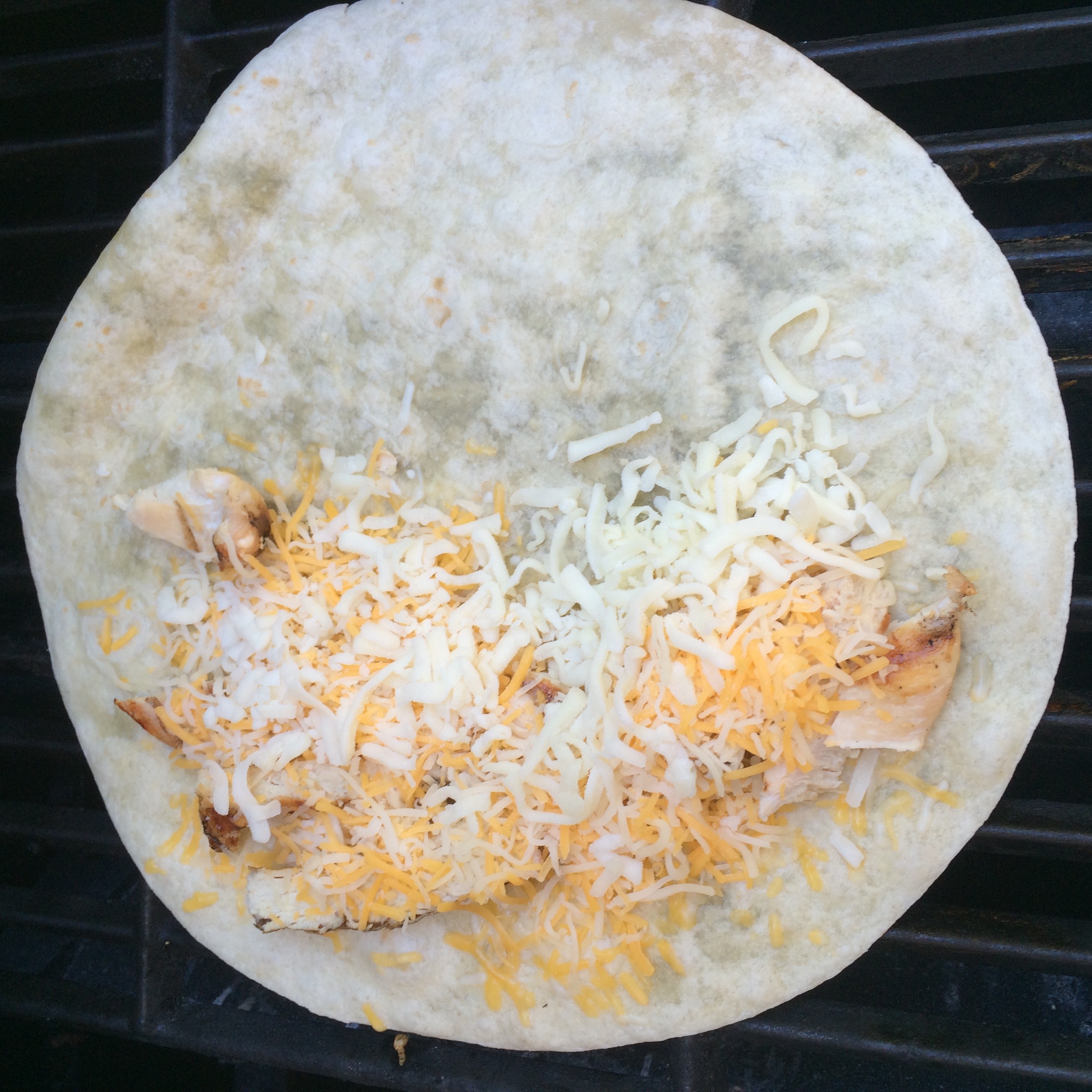 4. Place a tortilla on the grill and line one side with a few strips of chicken and enough cheese to cover. Flip the empty half on top and then brush that half (the half of the tortilla facing you) with some olive oil. After about 1-2 minutes, carefully flip the quesadilla to grill on opposite side. Grill for another 1-2 minutes or until cheese is melted.